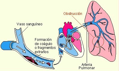 Cuando el coágulo se desprende, viaja por la circulación venosa, atraviesa el corazón derecho (aurícula y ventrículo) y finalmente se aloja en las arterias pulmonares. Una vez allí, genera dos efectos principales: