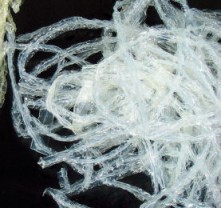 Se suele presentar en forma de escamas, placas o cordones de color blanco transparente que se hinchan en contacto con el agua formando una gelatina.